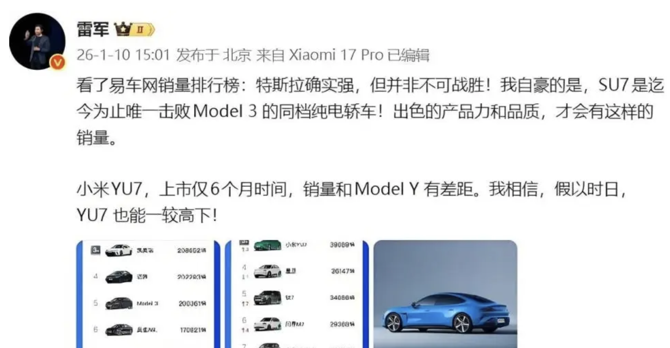 2026开年,雷军一条动态直接引爆车圈:“SU7是迄今为止唯一真正击败Model 3的同档纯电轿车。”对于还在爬坡期的YU7,他也坦然承认:“目前销量和Model Y还有差距,但假以时日,必能一较高下。”
